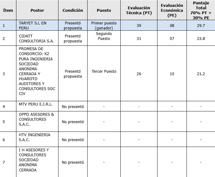 El postor ganador del proceso de selección de la empresa Auditora de Tráfico Vehicular del periodo anual 2026 – Concesionaria IIRSA Norte, es la empresa TARYET S.L. en Perú.